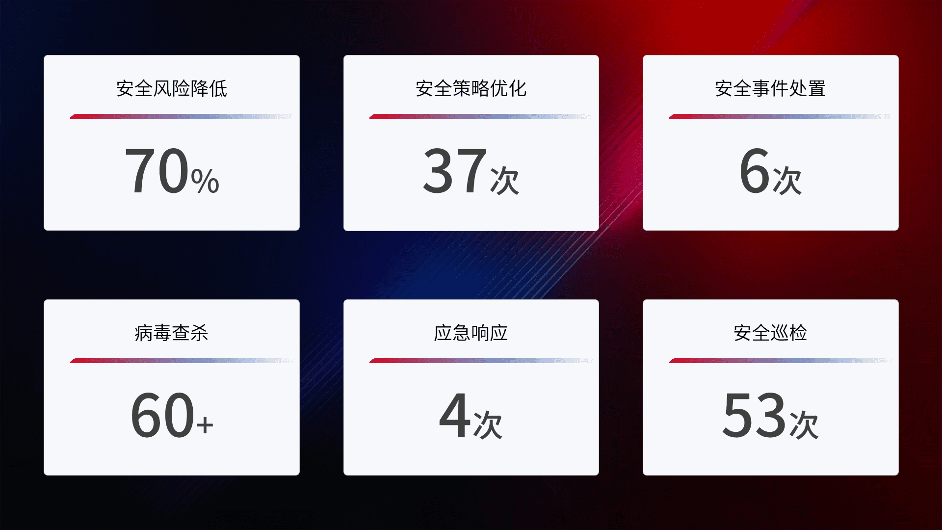 提供全面的安全事件报告体系,,包括处置报告、、、、周报、、、、季度和年度总结,,结合持续监控,,,,帮助客户深入了解网络安全状况。。。
